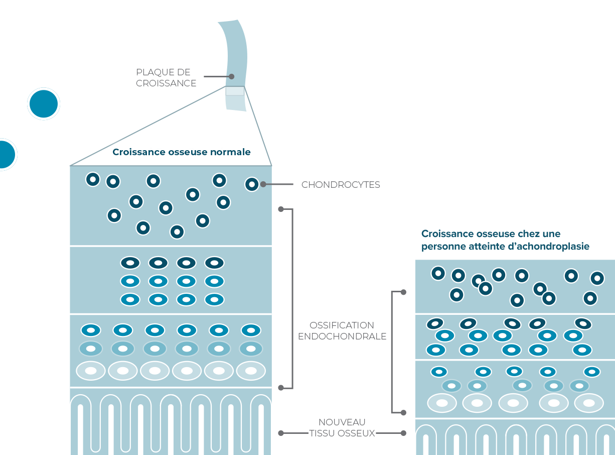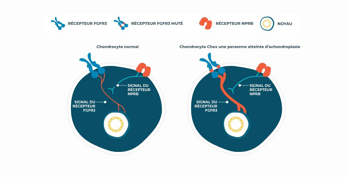 Chez les personnes atteintes d’achondroplasie, une modification de la structure du gène FGFR3 conduit l’organisme à envoyer continuellement des signaux qui ralentissent la croissance osseuse. Les récepteurs FGFR3 étant activés en permanence, les signaux qui freinent la croissance osseuse sont plus forts que ceux qui la favorisent (signaux des récepteurs NPRB).