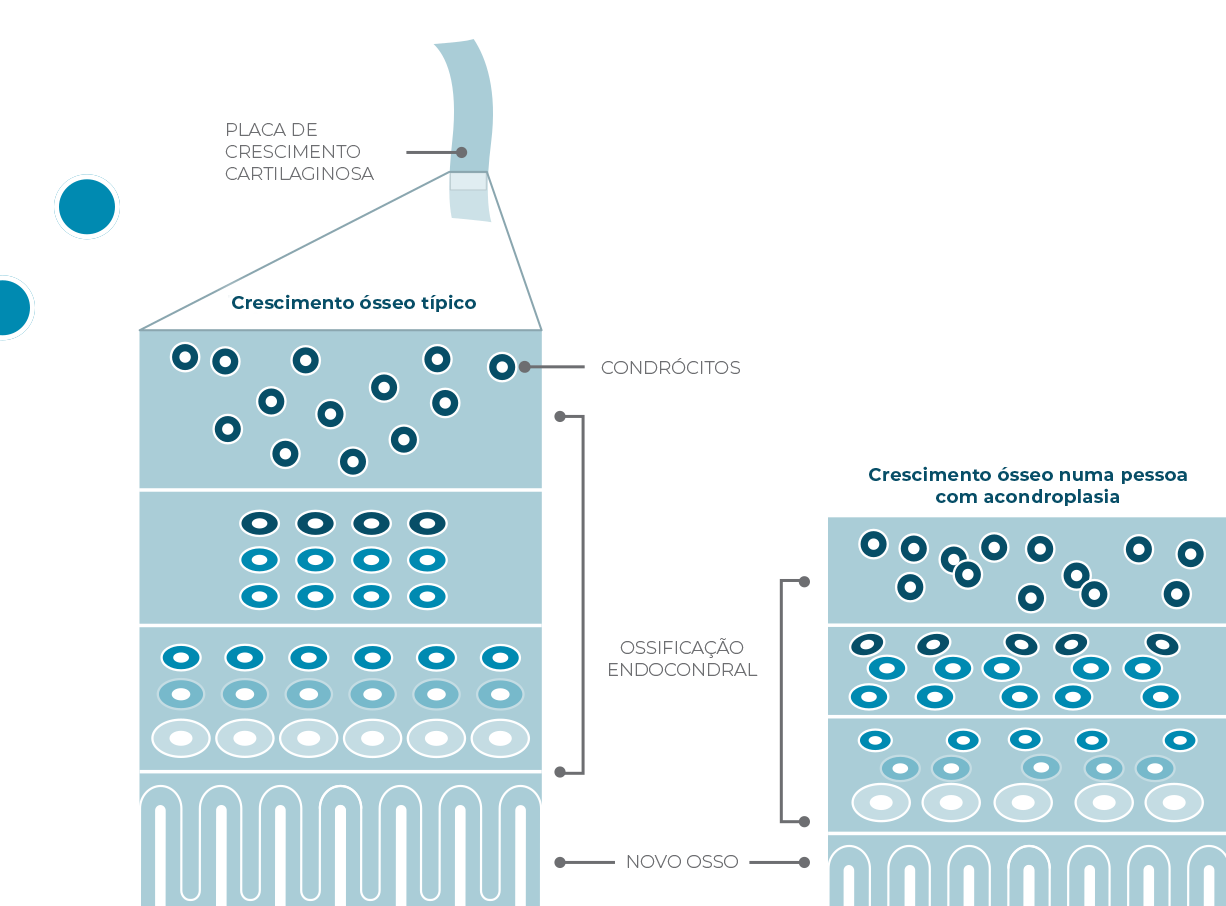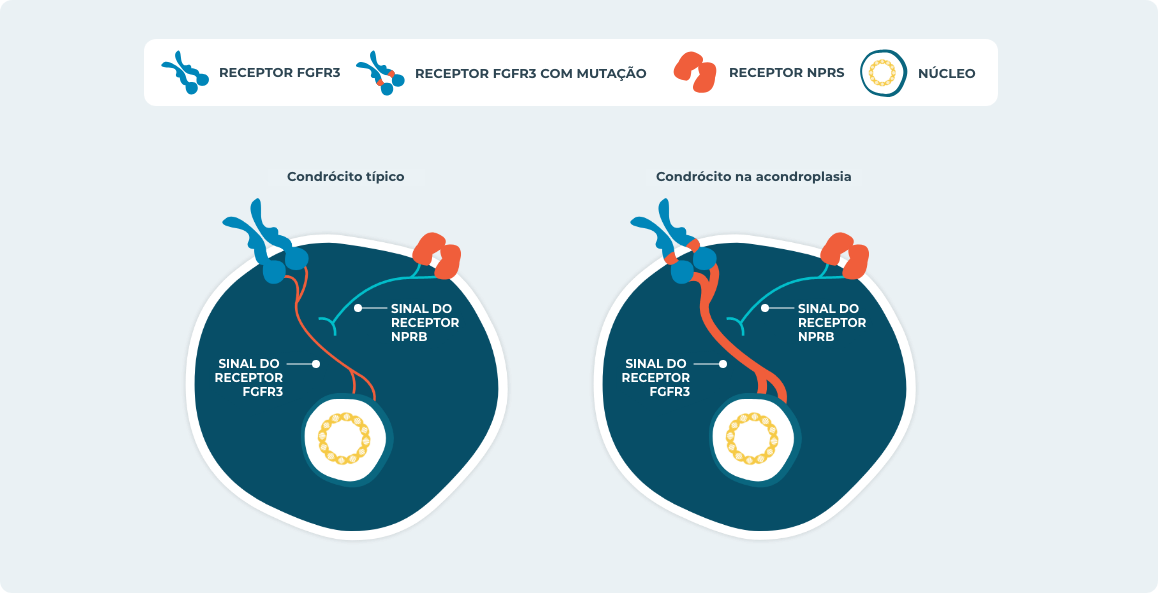 Na acondroplasia, uma alteração na estrutura do gene FGFR3 faz com que o corpo envie constantemente sinais para abrandar o crescimento dos ossos. Dado que os recetores FGFR3 estão sempre “ativados”, os sinais para abrandar o crescimento ósseo são mais fortes do que os sinais que instruem os ossos a crescerem (e que vêm dos recetores NPRB).